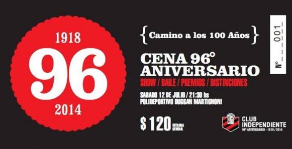 Es por eso que la dirigencia, por este medio, invita a toda la familia rojinegra a llenar el Polideportivo Duggan Martignoni para festejar el cumpleaños 93. Este sábado 9 de julio, a las 21.30, el club Independiente festejará un nuevo aniversario. Es por eso que la dirigencia, por este medio, invita a toda la familia rojinegra a llenar el Polideportivo Duggan Martignoni para festejar el cumpleaños 93. La institución de avenida Avellaneda se encuentra abocado a llevar a cabo todo lo correspondiente a la organización de los festejos de un nuevo aniversario. Por tal motivo se realizará una cena a la canasta en el Duggan Martignoni. En este evento habrá reconocimientos a distintas personalidades que han sido fundamentales en la historia rojinegra. También habrá desfile de deportistas, premios y un show inigualable. Independiente esta preparando un evento para celebrar un nuevo aniversario de una institución modelo de la ciudad. La entidad convoca a todos sus deportistas a encontrarse a las 21.20. Por otro lado se recuerda que habrá servicio de cantina. El club invita, por este medio, a familiares, socios y amigos a la cena que se llevará a cabo el 9 de julio a las 21.30 en el polideportivo. Te esperamos para que te sumes a esta cena. Para mayor información podrás dirigirte a la secretaria de la institución, de lunes a viernes de 8 a 20 o llamando al 425806.